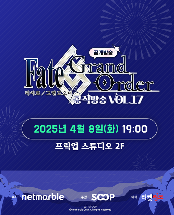넷마블(대표 권영식, 김병규)은 오는 4월 8일 유튜브를 통해 라이브되는 RPG <페이트/그랜드 오더>의 공식 방송을 이용자들과 함께하는 특별 공개 방송으로 진행한다고 밝혔다.