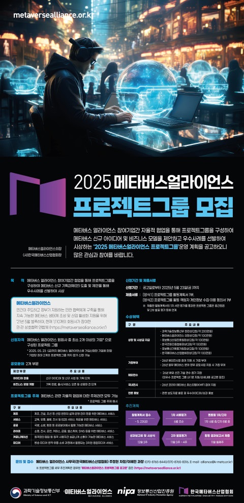 [디지털비즈온 이현주 기자] 메타버스 얼라이언스(의장 유지상) 사무국(한국메타버스산업협회)은 3월 31일부터 ‘2025 메타버스 얼라이언스 프로젝트 그룹’을 모집한다고 밝혔다.