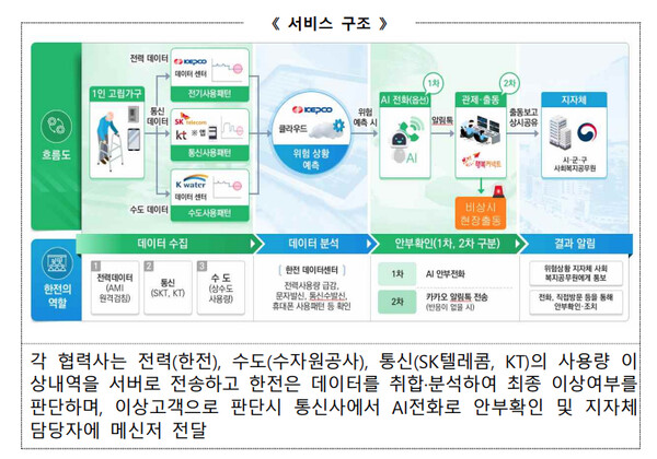 한전의 'AI 고독사 예방 서비스'는 전력, 통신(SK텔레콤, KT), 수도(수자원공사) 등 인간 생존에 필수적인 생활 데이터를 AI로 정밀하게 분석하여 이상 징후를 감지하면 지자체 사회복지공무원에게 SMS로 위험 상황을 알리는 서비스이다.
