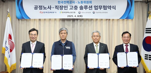 한전과 전국전력노동조합(위원장 최철호)은 4월 8일(화) 나주혁신도시 한전 본사에서 중앙노동위원회(위원장 김태기), 전남지방노동위원회(위원장 고동우)와 ‘공정노사 솔루션 및 직장인 고충 솔루션 업무협약’을 체결하였다.