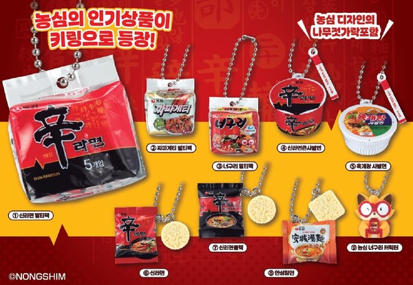 농심이 일본 대표 완구회사 ‘반다이’와 협업해 농심 라면 한글 패키지 디자인을 그대로 구현한 키링을 글로벌 시장에 선보인다.