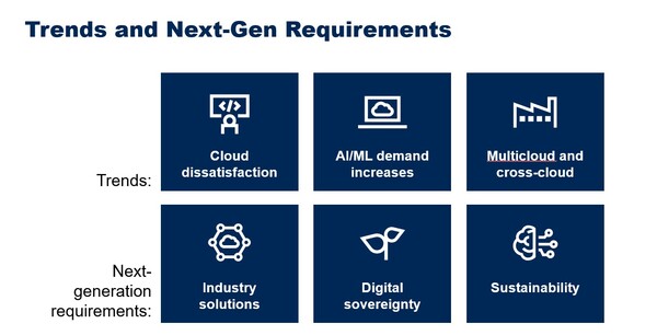 가트너는 클라우드 도입을 이끌 주요 트렌드로 ▲클라우드 불만족 ▲AI 및 머신러닝(ML) 수요 증가 ▲멀티클라우드 및 크로스클라우드 ▲산업 특화 솔루션 ▲디지털 주권 ▲지속가능성을 꼽았다. 이와 같은 트렌드는 클라우드의 미래를 주도하고 궁극적으로는 디지털 중심의 혁신적 업무 방식을 창출할 것이라 전망했다.