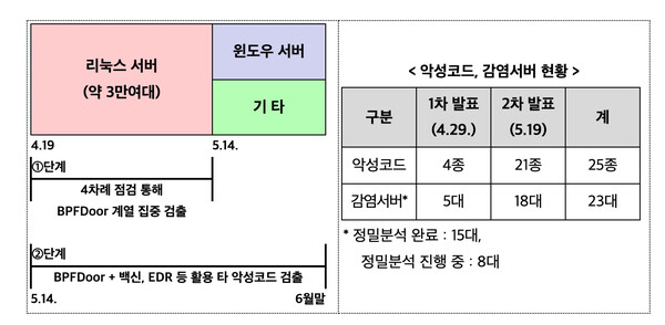조사단은 5월19일 현재 총 23대의 서버 감염을 확인하여 15대에 대한 디지털 자료 복원(포렌식) 등 정밀분석을 완료하고 잔여 8대에 대한 분석을 진행함과 동시에 타 악성코드에 대해서도 탐지 및 제거를 위한 5차 점검을 진행하고 있다. 현재까지 악성코드는 25종(BPFDoor계열 24종 + 웹셸 1종)을 발견⋅조치했다.