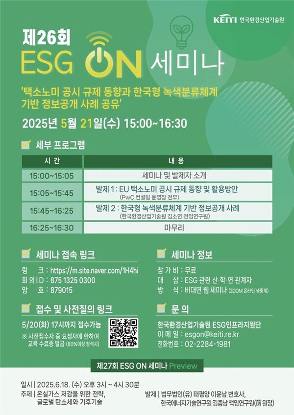 [디지털비즈온 이은광 기자] 한국환경산업기술원은 유럽연합 녹색분류체계 공시 규제 동향과 한국형 녹색분류체계 기반 정보공개 사례 공유를 주제로 5월 21일 오후 3시 ‘제26회 이에스지(ESG) 온(ON) 세미나’를 온라인으로 개최한다.