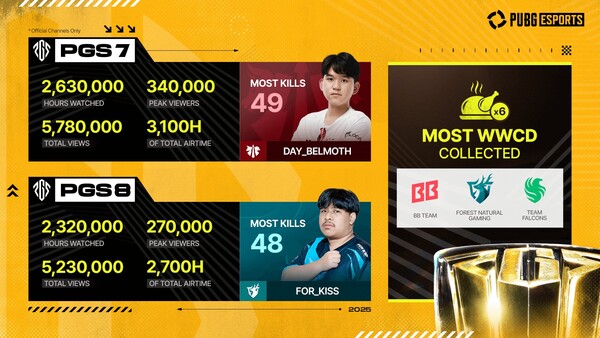 가장 많은 치킨을 획득한 팀은 BB팀(BB Team), 팀 팔콘스(Team Falcons), 포레스트 네추럴 게이밍(Forest Natural Gaming)팀이 각각 6번의 치킨을 획득한 팀이 되었다. 최다 킬을 기록한 선수는 PGS 7의 데이트레이드 게이밍(Daytrade Gaming) 소속 벨모스(Belmoth) 선수로 49킬을, PGS 8에서는 포레스트 네추럴 게이밍(Forest Natural Gaming)의 키스(KISS) 선수가 48킬을 기록하며, 각각의 대회에서 최고 수준의 경기력을 증명했다.