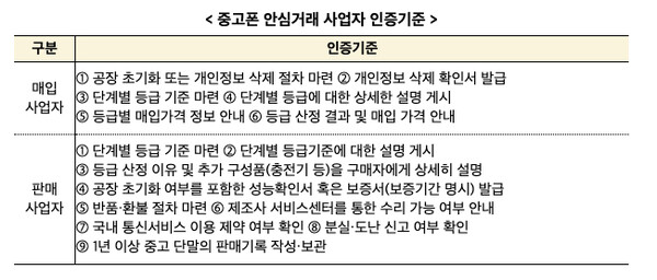 인증기준은 개인정보 삭제 절차 마련, 단말기 등급별 매입가격 정보 제공 등 이용자 보호를 위한 기본적인 요건으로 구성되어 있다. 과기정통부는 한국정보통신협회를 인증기관으로 지정하고, 인증기관(한국정보통신협회)은 서류심사 및 현장실사를 통해 인증기준을 총족한다고 판단되는 사업자에게 인증서를 발급한다.