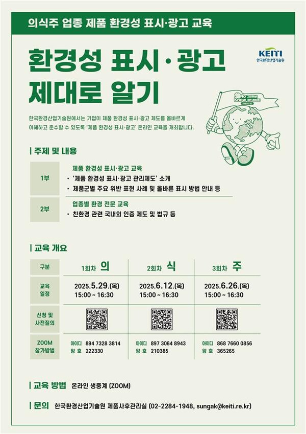 [디지털비즈온 이은광 기자] 한국환경산업기술원은 5월 29일부터 3회에 걸쳐 의식주 업종에 관련된 기업을 대상으로 올바른 제품 환경성 표시·광고 교육*을 온라인으로 실시한다.