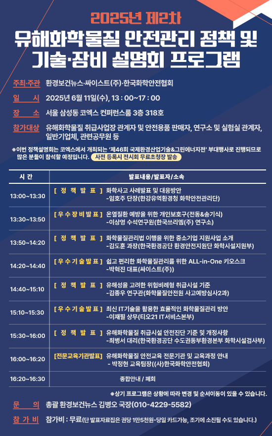 환경보건뉴스와 싸이스트㈜, (사)한국화학안전협회는 오는 6월 11일(수), 서울 삼성동 코엑스 3층 컨퍼런스룸 318호에서 ‘2025년 제2차 유해화학물질 안전관리 정책 및 기술·장비 설명회’를 공동 개최한다고 밝혔다.