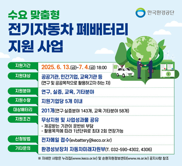 [디지털비즈온 이은광 기자] 환경부 산하 한국환경공단(이사장 임상준)은 6.13일부터 ‘2025년 수요 맞춤형 전기자동차 폐배터리 지원사업’ 신청서를 접수한다.
