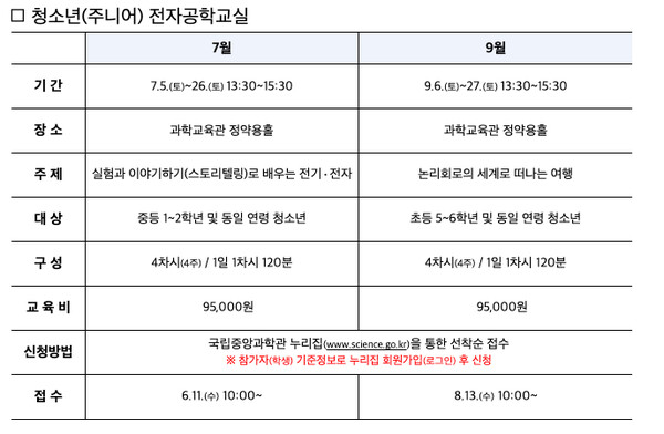 국립중앙과학관(관장 권석민)은 「청소년(주니어) 전자공학교실」을 오는 7월과 9월 매주 토요일(각 4차시) 새롭게 운영한다고 밝혔다.