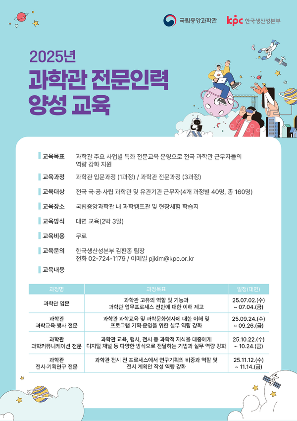 「2025년도 과학관 전문인력양성 교육」 참가자 모집에 대한 자세한 내용은 국립중앙과학관(www.science.go.kr)와 한국생산성본부(www.kpc.or.kr) 누리집을 통해 확인할 수 있다.