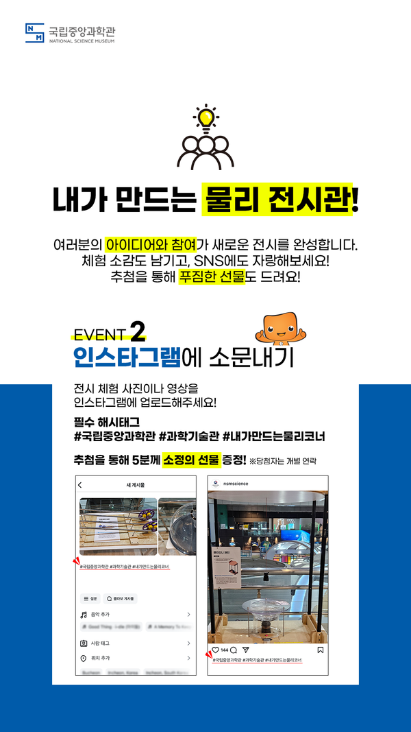 시제품을 체험한 관람객은 관객 참여 행사를 통해 전시품에 대한 다양한 의견을 제안할 수 있으며, 인스타그램에 체험 후기를 공유하는 ‘물리분야(물리코너) 소문내기’행사도 함께 진행된다. 참여자에게는 추첨을 통해 소정의 선물을 증정한다.