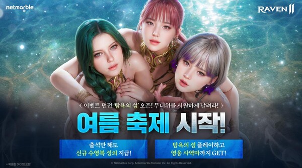넷마블(대표 김병규)은 MMORPG ‘레이븐2(개발사 넷마블몬스터)’에 ‘수영복 성의 2종’ 등 여름 업데이트를 진행했다고 9일 밝혔다.