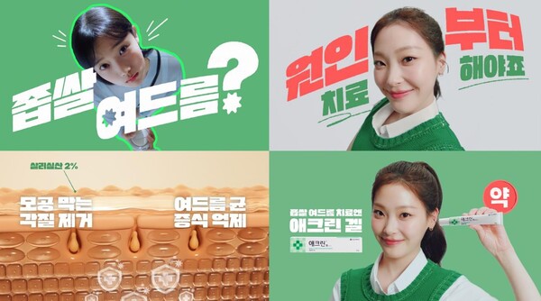 신규 광고 영상은 깨끗한 세안과 꾸준한 피부관리로도 지속 발생하는 좁쌀여드름을 보여주며 좁쌀여드름을 없애기 위해서는 근본적인 원인을 치료해야 한다고 전한다. 이어 애크린 겔의 주성분인 살리실산 2%를 통한 각질 제거 및 여드름균 증식 억제 효능을 강조하며 “좁쌀여드름 치료에는 애크린 겔”의 나레이션으로 마무리한다.