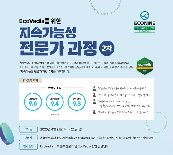 [디지털비즈온 이은광 기자] ESG 전문 자문 그룹 ㈜에코나인이 글로벌 ESG 평가기관 EcoVadis와 공동 개발한 ‘지속가능성 전문가 과정’ 2차 교육을 오는 8월 21일~22일 개최한다고 밝혔다.