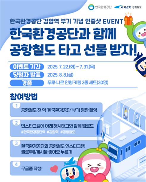 세부적으로 한국환경공단역 역사내에서 △역명부기 기념 환경사랑공모전 수상작 전시회 개최 △국민과 함께하는 친환경 캠페인 실시 △한국환경공단역 사용개시 기념 SNS 이벤트 등이 진행됐으며,이번 달 말까지 공항철도와 협업으로 ‘한국환경공단과 함께 공항철도 타고 선물받자!’ 이벤트 등을 진행해 지속적인 국민관심을 이끌 예정이다.
