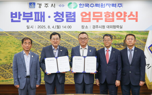 한국수력원자력(사장 황주호, 이하 한수원)이 4일 경주시청(시장 주낙영)과 한수원 황주호 사장, 최익규 상임감사위원, 경주시 주낙영 시장이 참석한 가운데 부패근절과 청렴도 제고를 위한 ‘반부패⸱청렴 업무협약식’을 개최했다.