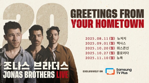 삼성전자는 이번 조나스 브라더스의 투어 중 8월 11일(이하 한국시각)에 열리는 미국 뉴저지 메트라이프 스타디움 공연을 시작으로 ▲9월 1일 텍사스 ▲10월 13일 위스콘신 ▲10월 27일 플로리다 ▲11월 10일 뉴욕 공연 등 총 5차례의 공연을 삼성 TV 플러스를 통해 생중계한다.