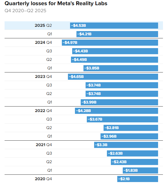 [디지털비즈온 송민경 기자] 메타(Meta)의 메타버스 전담 부서 ‘리얼리티 랩스(Reality Labs)’가 2분기에도 막대한 적자를 기록한 것으로 공개됐다. 메타는 2분기 실적 발표를 통해 리얼리티 랩스 부문이 45억3천만 달러(약 6조2천억 원)의 영업손실을 기록했다고 밝혔다.