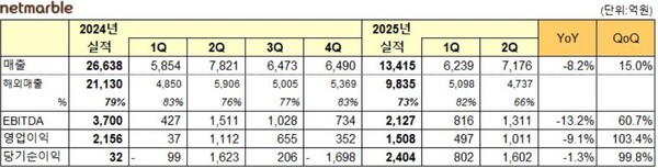 넷마블(대표 김병규)은 2025년 2분기 연결기준으로 매출 7,176억원(YoY -8.2%, QoQ 15%), EBITDA(상각전 영업이익) 1,311억원(YoY -13.2%, QoQ 60.7%), 영업이익 1,011억원(YoY -9.1%, QoQ 103.4%), 당기순이익 1,602억원(YoY -1.3%, QoQ 99.8%)을 기록했다고 7일 밝혔다.