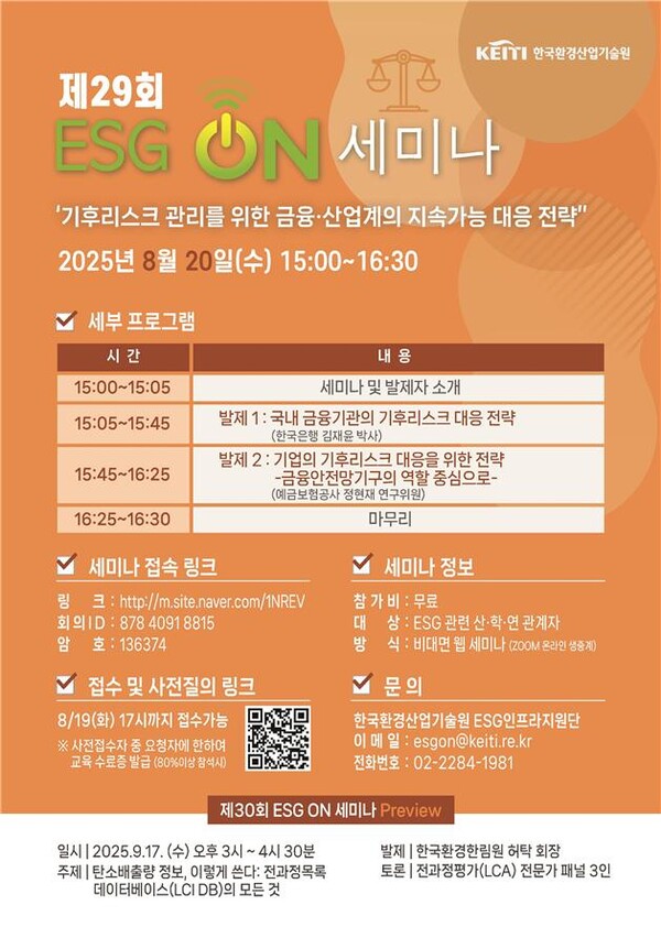 [디지털비즈온 이은광 기자] 한국환경산업기술원은 기후위험 관리를 위한 금융·산업계의 지속가능 대응 전략을 주제로 8월 20일 오후 3시 ‘제29회 이에스지(ESG) 온(ON) 세미나’를 온라인으로 개최한다.