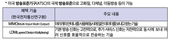 이번에 선정된 한국전자통신연구원 기술은 미국 방송표준기구 3.0 기술*을 활용하여 한정된 주파수를 가지고 데이터를 효율적으로 보내기 위한 전송 기술로써, 이용자의 텔레비전에서 방송을 수신하는 하드웨어(수신 칩 등)를 결정하기 때문에 매우 중요하다.