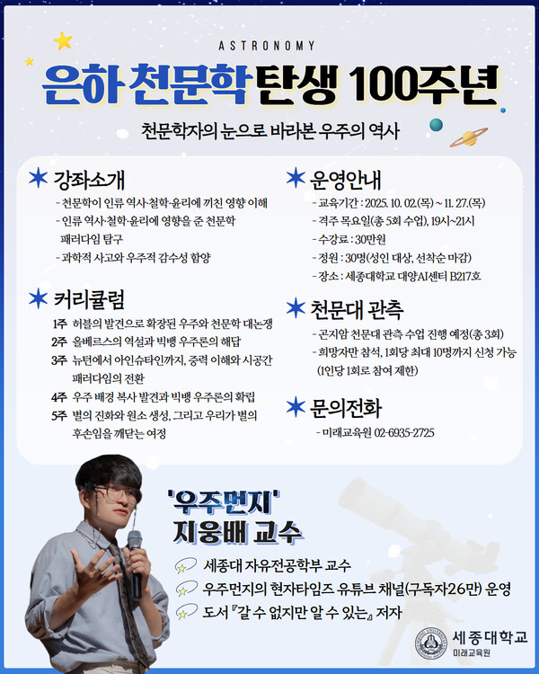 세종대학교(총장 엄종화) 미래교육원은 오는 10월 2일부터 11월 27일까지 격주 목요일에 「은하 천문학 탄생 100주년: 천문학자의 눈으로 바라본 우주의 역사」 과정을 운영한다.