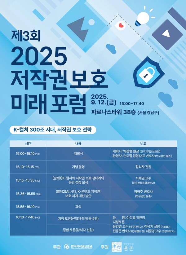 한국저작권보호원(원장 박정렬, 이하 보호원)은 오는 9월 12일(금) 파르나스타워 38층에서 제3회 '2025 저작권 보호 미래 포럼'을 개최한다.