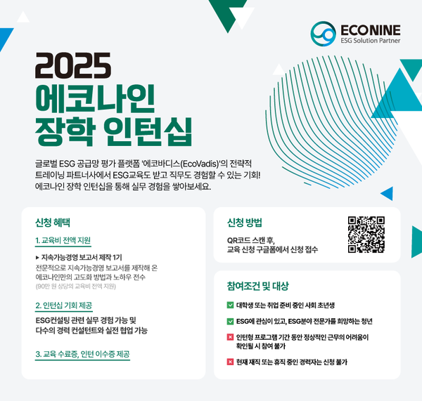 지속가능경영 전문 자문사 에코나인(ECONINE)이 ESG 전문가를 꿈꾸는 대학생 및 취업 준비생을 대상으로 ‘2025 장학 인턴십 프로그램’을 진행한다. 이번 프로그램은 교육비 전액 지원과 현장 실무 경험을 결합한 특별한 기회로, 미래 ESG 인재 양성을 목표로 한다.