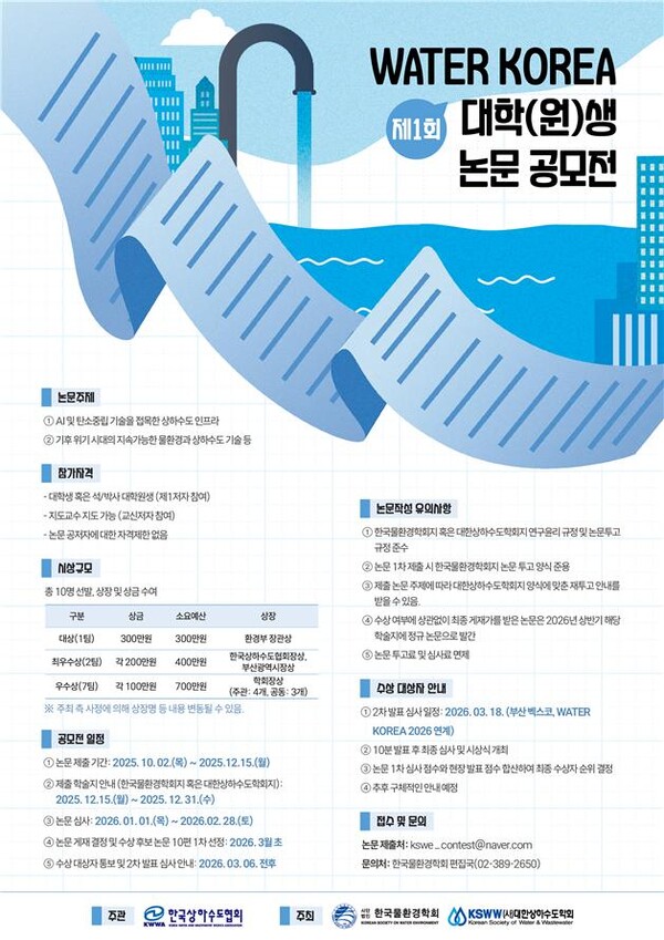 한국상하수도협회(협회장 유정복 인천광역시장, 이하 ‘협회’)는 오는 10월 2일부터 12월 15일까지「제1회 WATER KOREA 대학(원)생 물 연구 논문 공모전」참가자를 모집한다.