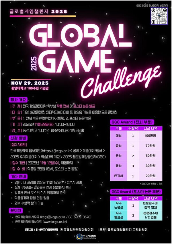글로벌게임챌린지2025의 사전 등록은 11월 12일(수)까지 한국게임학회 홈페이지(https://kcgs.or.kr/homepage/static/p5)에서 할 수 있다.