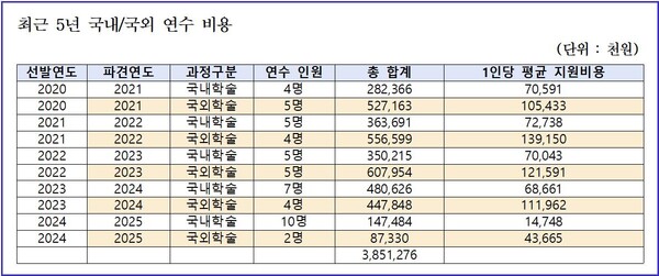 자료에 따르면, 2020년부터 2024년까지 총 52명(국내 32명, 해외 20명)이 학위 연수를 다녀왔으며, 연간 학비만 5천만 원에서 1억 원에 달한다. 미국 하버드대, 스태펀드대, 영국 옥스퍼드대 등 세계적 명문대도 다수 포함돼 있지만, 논문 제출자는 단 9명에 불과했다.