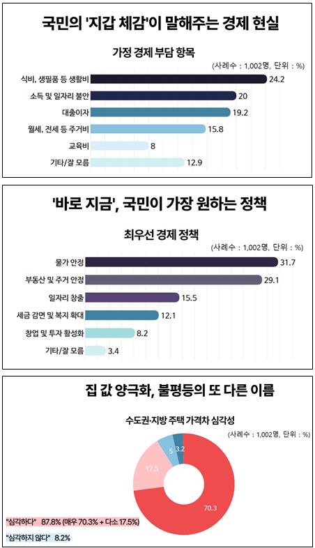 국민이 꼽은 최우선 경제 정책 과제는‘물가 안정’(전체 1위)이었다. 특히 40대 37.7%, 70세 이상 40.3%가 물가 안정을 최우선으로 꼽아, 소득이 정체된 고정소득층이 물가 상승으로 직접적인 생계 위협을 느끼고 있음을 보여줬다. 지역별로는 광주·전남·전북 43.3%, 직업별로는 가정주부(33.7%)와 자영업자(35.0%)가 물가 안정 요구를 가장 높게 나타냈다.